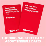 This is the main 400-card starter deck for Red Flags. From the creator of Superfight, Red Flags is a party game about convincing your friends to go on terrible dates. Here's how it works: One of your friends is going to be the single. Every other player uses perk cards to make a hot date that they think would be a great match for that person. You'll get characters like: a brain surgeon that loves to cuddle, an gymnast that loves video games, and a famous musician that owns your favorite sports team But then everyone gets to play a Red Flag onto another player at the table. Now all of these perfect dates will have flaws like: Punches every barista they see, wears a diaper because it's "more convenient," or collects human skulls, says they're practically free! Now that all of the dates are horrible, everyone tries to convince the single to go out with their date. That's pretty much it. The game can be as raunchy or tame as your imaginations allow.