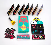 Packed in the usual, compact Oink Games box comes seven wooden card stands, a small handbell, and other eye-catching components. For 2-7 players, this is a game that's a lot of fun even for small children.