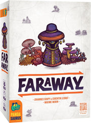 Each turn, you play a card from a hand of 3. Then you pick a new card from a face-up river. As play is simultaneous in Faraway, you must take into account a clever priority system in all of your choices – being last to pick a card leaves you with fewer options and often less profitable choices for the next turns.