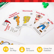 Flapjacks and Sasquatches is an easy, "take that" style card game in which you want to chop down the tree card in front of you. The card has both a "chop" value and a point value; using Axe cards, you roll dice to try to meet or exceed the "chop" value. When you do, you collect the tree (and the points). Flapjack cards can add to your roll, while blister cards can take away.