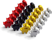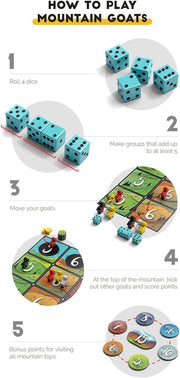 In Mountain Goats you work to move your goats to the top of 6 different mountains where they can score points as long as they stay there. You can share spaces with other goats on the way up, but there is only room for one goat at the top of each mountain. If someone else's goat moves to the mountain top, they will kick you off and you'll have to start your trek over.