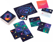 Players take turns placing cards in a grid to create an ever-expanding galaxy. Players score points based on connecting stars to form constellations, nebulas, and black holes. Depending on which combination of scoring cards are in play, players can score points in different ways for each galaxy card played: