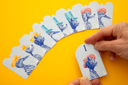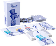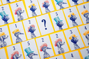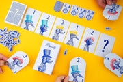 Each round in Petiquette, players look at a line-up of five random cards — with cards showing one of three animals that is wearing one of three hats, with a number from 1-5 at top — and try to find some logic or pattern within them. Each player secretly chooses the card they think would most properly fit into that pattern. For example, if the sequence is "red, red, yellow...", you might feel that yellow should come next. If it's "dog, cat, bird...", then maybe dog feels right...but what about "dog, cat, dog, cat, bird"? No single answer is correct, but if someone chooses the same card as you, you both earn points.