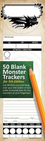 - Has spaces to write the creature’s' AC, HP, attacks, special powers, ability and skill modifiers, saving throws, resistances and immunities, CR, etc. for DM reference