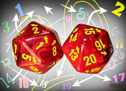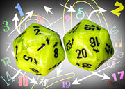 Chessex Countup&down™ dice are a unique tool for games that require keeping a counter. If you position the dice on the table so that the number is facing upward, the next number down will always be the number below. For ease of use, on each face there is an indicator pointing towards the next highest number. They are larger than normal 18mm d20s. These are 25mm in diameter from face to face.