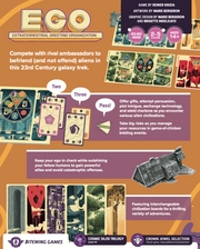 In EGO (Extraterrestrial Greeting Organization), players proceed through a sequence of major and minor events including auctions, drafts, risks, and more. Risks and egos are the lifeblood of this game as players will frequently find themselves in a game of chicken with their rival ambassadors as they try to impress various alien civilizations and earn political power.