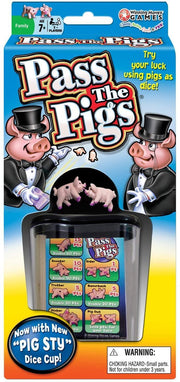 This Pass the Pigs classic party game consists of 2 pigs you use as dice, pad, 2 pencils and carrying case. Roll them as many times as you dare on your turn to score points. Just don't role a 'pig out' or an 'oinker'. First person to 100 points wins. Makes an ideal travel game with its small plastic carrying case.