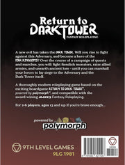 RETURN TO DARKTOWER: A new evil has taken the Dark Tower. Will you rise to fight against this Adversary, and become of hero of the Four Kingdoms? Over the course of a campaign of quests and marches, you will: fight fiendish monsters, raise allied armies, and unearth ancient lore - until you can marshall your forces to lay siege to the Adversary and the Dark Tower itself. A thoroughly modern roleplaying game based on the exciting board game Return to Dark Tower, powered by polymorph, and compatible with the award-winning Mazes Fantasy Roleplaying. High quality hardcover book with over 200 full color glossy page and removeable map. For 2-6 players, ages 13 and up if you are brave enough.