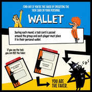 Experience the thrill of Jackbox Games Fakin’ It in a brand-new, tangible card game format! This lively party game pits players against each other in a quest to uncover which friend is a master of deception. Each round features a task card with a challenge on it that the players must complete. Each player reads it secretly using their personal wallets. But beware—the Faker’s wallet won’t reveal the task, so they have to improvise and fake it! Players must try to identify who among the group is the faker! Test your skills across five engaging categories: Hands of Truth (raise your hand or keep it down), Number Pressure (show a number of fingers between 1-10), You Gotta Point (point at another player or yourself), Face Value (make a facial expression), and Text You Up (answer a question truthfully). Can you deceive your friends? Master the art of deception as the Faker, or sharpen your sleuthing skills to unmask the impostor among your friends!