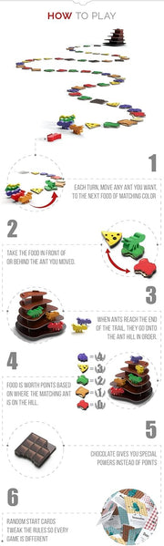 • Ant Hill - Food tokens are worth more points if the matching ant gets to the hill FIRST. Or, food tokens are worth more points if the matching ants get to the ant hill LAST.