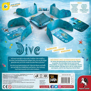 Dive explores the notion of perception, the ability of the divers to observe the ocean through a deck of transparent cards and to benefit from their observations. At the start of each round, you look into the "waters" before you to see how far you want to dive, with five levels being the maximum you can go (since you have five tokens). You then place the tokens on your board: