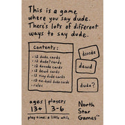 Contents: 72 Cards (12 dude. cards, 12 dude? cards, 12 dooode cards, 12 dewd cards, 12 tiny dude cards, 12 tie-dyed dude cards),  1 Rulebook