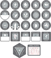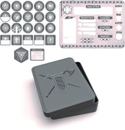 This token set is designed to allow you to easily and quickly track your character’s status effects. If your character is frightened, paralyzed or unconscious, your allies will be able to see at a glance that you are in need of help. Because all of our full-color tokens are made of durable perspex they are wet-erasable, so you can write additional information straight onto them. The combat tile provides a place for you to keep a running total of constantly changing statistics like character health and resources, all without dirtying your character sheet with eraser marks. Presented in a unique class tin, with space to add your character’s name.