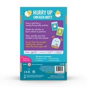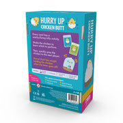 Hurry Up Chicken Butt is akin to a game of "hot potato", but with a chicken-shaped shaker that clucks and holds the dice, with players needing to complete silly challenges in order to pass the chicken.