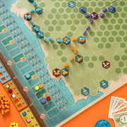 In Iberian Gauge, you will invest in railroad companies during Stock Rounds. In the Operating Rounds, each share of stock allows the shareholder to build track for that company, in the order those shares were purchased. But building in such hostile terrain is expensive! Leasing track from other companies reduces cost and keeps your railroads expanding. Failure to expand will sink your stock values, leading to ruin!