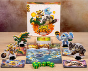 King of Tokyo: Origins is a standalone game in the King of Tokyo series that's meant to serve as an entry point for new players since it's a smaller, more affordable package. The game includes four new monsters, an assortment of new power cards mixed with older ones, energy cubes, and green dice with yellow characters.