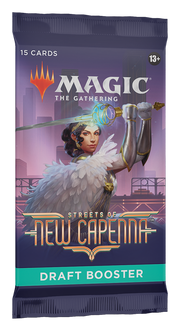 Draft Boosters are specifically designed for the best Magic: The Gathering booster draft play experience. Each Streets of New Capenna Draft Booster contains 15 Magic cards and 1 token, ad card, or counter punchout card, with a combination of 1 card of rarity Rare or higher and 3 Uncommon, 10 Common, and 1 Land cards. A traditional foil card of any rarity replaces a Common in 33% of Streets of New Capenna Draft Boosters. Traditional foil Borderless Mythic Planeswalker in <1% of boosters.
