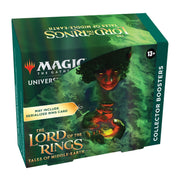 In secret, Sauron forged a booster—one far more powerful than those owned by Elf, Dwarf, or Man. In this Collector Booster, Sauron sealed away the most incredible cards to grace Middle-earth: foils, Showcase cards, Borderless cards, and more. Who knows what these cards could do in the wrong hands? At least with you, we know they’ll look great. The Lord of the Rings: Tales of Middle-earth Collector Booster Box contains 12 The Lord of the Rings: Tales of Middle-earth Collector Boosters and 1 Traditional Foil Box Topper card. Each Collector Booster contains 15 Magic: The Gathering cards and 1 Traditional Foil double-sided token, with a combination of 5–7 cards of rarity Rare or higher and 3–5 Uncommon cards, 3–6 Common cards, and 1 Full-Art Middle-Earth Map Land card. Every pack contains a total of 8–10 Traditional Foil cards and may contain 1 Surge Foil Box Topper card.