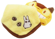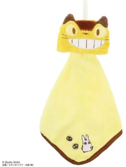 Soft Studio Ghibli Micro Loop Towel from Marushin. Features character towel cover (3.5 x 4.7") and attached microfiber towel (9.8 x 9.8") with embroidered image. Microfiber towel can be rolled up into towel cover. Cover features a loop for hanging. Cat Bus themed from the Studio Ghibli film "My Neighbor Totoro".
