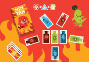 Each player starts with a hand of nine cards, with cards belonging to one of three suits — rock/paper/scissor — and being valued from -6 to 10. Place three random cards face up on the table in separate piles; these are your first targets.