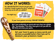Poetry for Neanderthals is a competitive word-guessing game where you can only give clues by speaking in single syllables. So, instead of saying "broccoli," you'd say something like "green thing you eat for live long and have good health." If you mess up and use a big word, such as "vegetable," you get bopped on the head with a NO! Stick.   It's a game that forces you to explain complicated ideas using simple vocabulary.