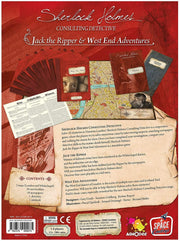 Sherlock Holmes Consulting Detective: Jack the Ripper & West End Adventures is a standalone expansion to Sherlock Holmes Consulting Detective with updated graphics that features ten more cases to be solved in Sherlock Holmes' Victorian-era London, England. A "London Directory", map, and newspaper archives are included with the cases.