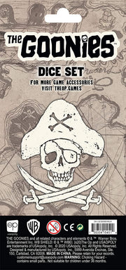 Take The Goonies to your next game night with this Astoria approved set of dice! This 6-sided dice set features illustrations of iconic visuals from the classic 80s treasure hunting adventure film, including One-Eyed Willy, Chunk’s bike, candy bar, pirate ship, Doubloon, and Sloth.