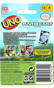 The UNO matching card game everyone loves rides into the Mario Kart world of crazy obstacles and racing go-karts! Graphics from the game on every card make this unique pack a collectible for fans. It plays like classic UNO, except every card has an ITEM icon in the corner (Mushroom, Banana Peel, Green Shell, Lightning, or Bomb). The ITEMS don't do anything during normal play. But when the wild Item Box Card is played, the player flips over the top card of the Draw Pile and immediately uses the ITEM on that card! Each ITEM has a different action. This pack makes a great toy for players 7 years and older, especially Mario Kart fans. Colors and decorations may vary.