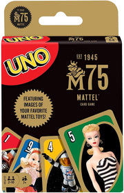 UNO, the classic card-matching game by Mattel, is celebrating its 75th anniversary with a special-edition deck that celebrates Mattel toys throughout the years! Each card is decorated with another childhood favorite, like Barbie doll, Hot Wheels cars, Fisher-Price pre-school toys and more. Game play is like classic UNO. Match cards by color or number and play action cards like Skip, Reverse and Wild Draw Four to shake up the competition. Score points by being the first to get rid of all the cards in your hand, and when you're down to one card, don't forget to yell "UNO!" This collectible deck makes a great gift for 7 year olds and up, especially toy lovers. Colors and decorations may vary.